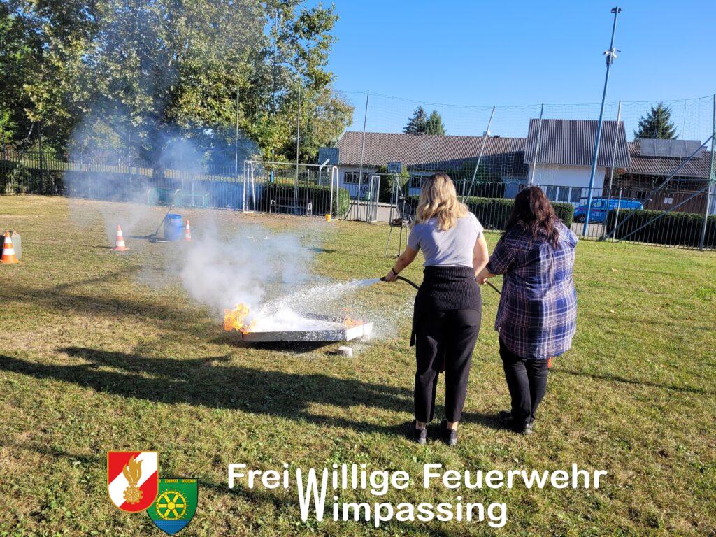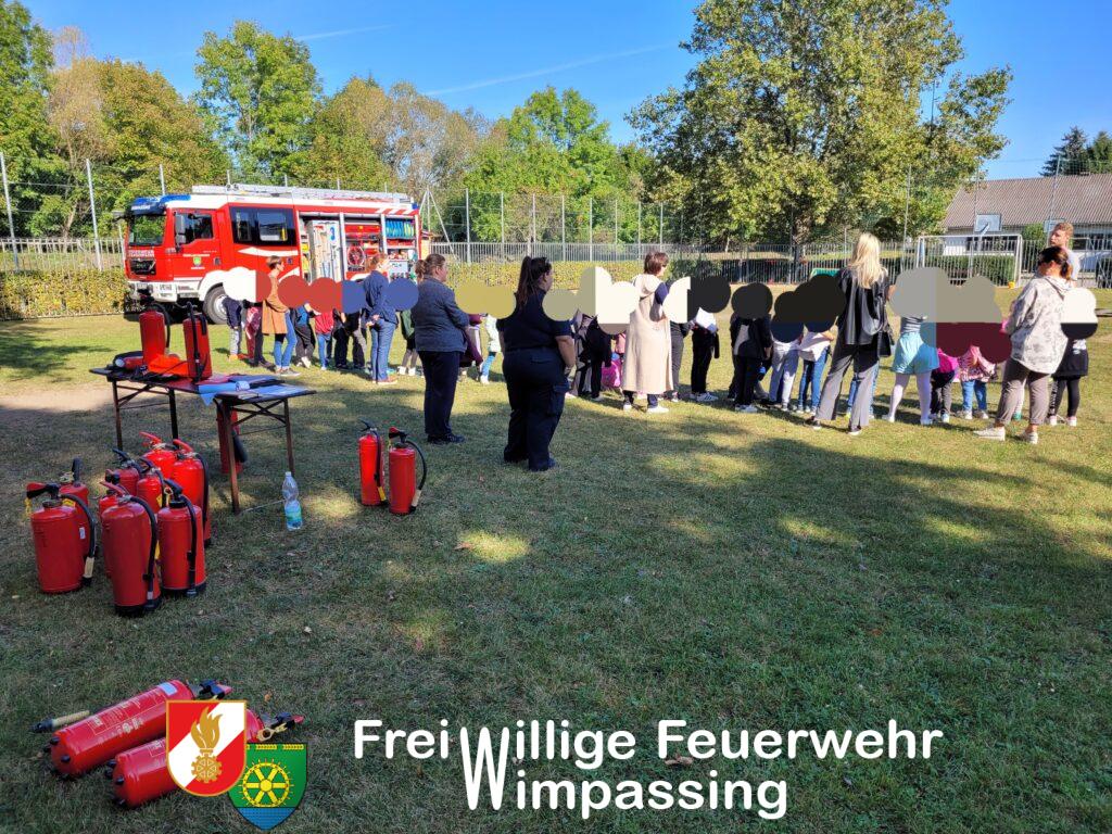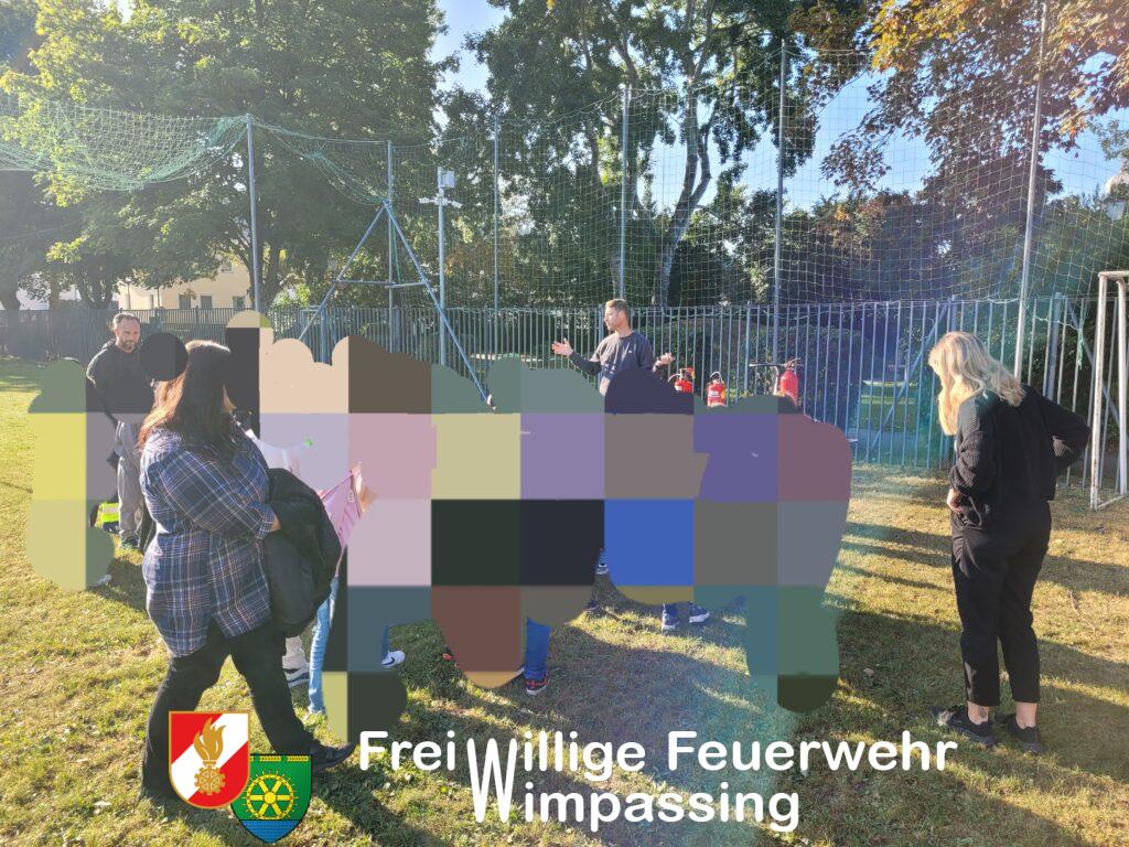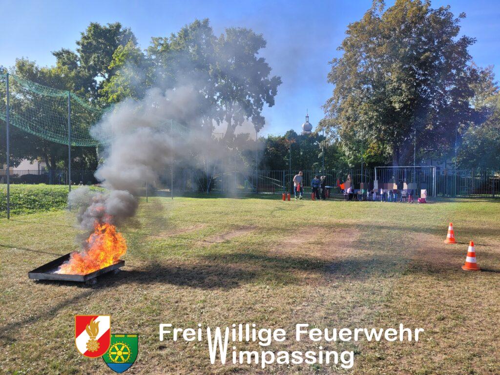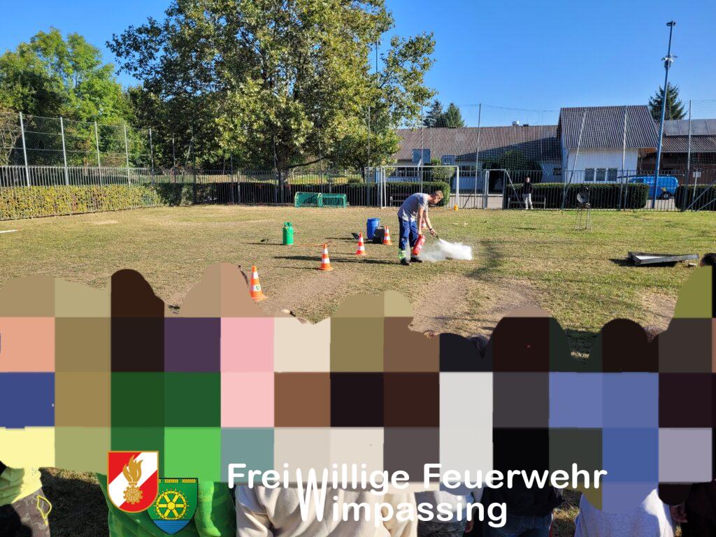 Danach wurde eine Brandschutzerziehung durch den Brandschutzbeauftragten der Marktgemeinde Wimpassing und der Freiwilligen Feuerwehr Wimpassing auf der Sportanlage abgehalten. Dazu wurden alle Klassen der Volksschule, die beiden Landeskindergärten, sowie alle Pädagoginnen mit dem Thema Brandschutz und richtiges Verhalten im Not- und Brandfall vertraut gemacht. Die Pädagoginnen lernten dazu die praktische Handhabung und den richtigen Umgang von Handfeuerlöscher. Zusätzlich konnten die Kinder im Anschluss unser Feuerwehrauto besichtigen und die dort gelagerte Ausrüstung unter die Lupe zu nehmen.