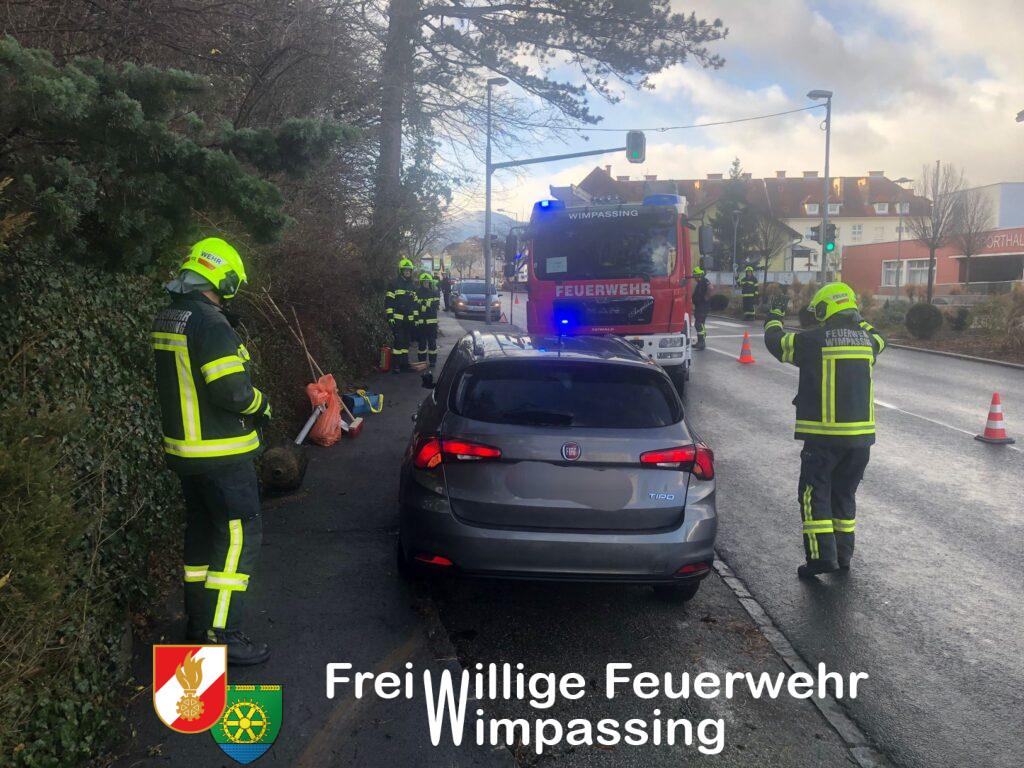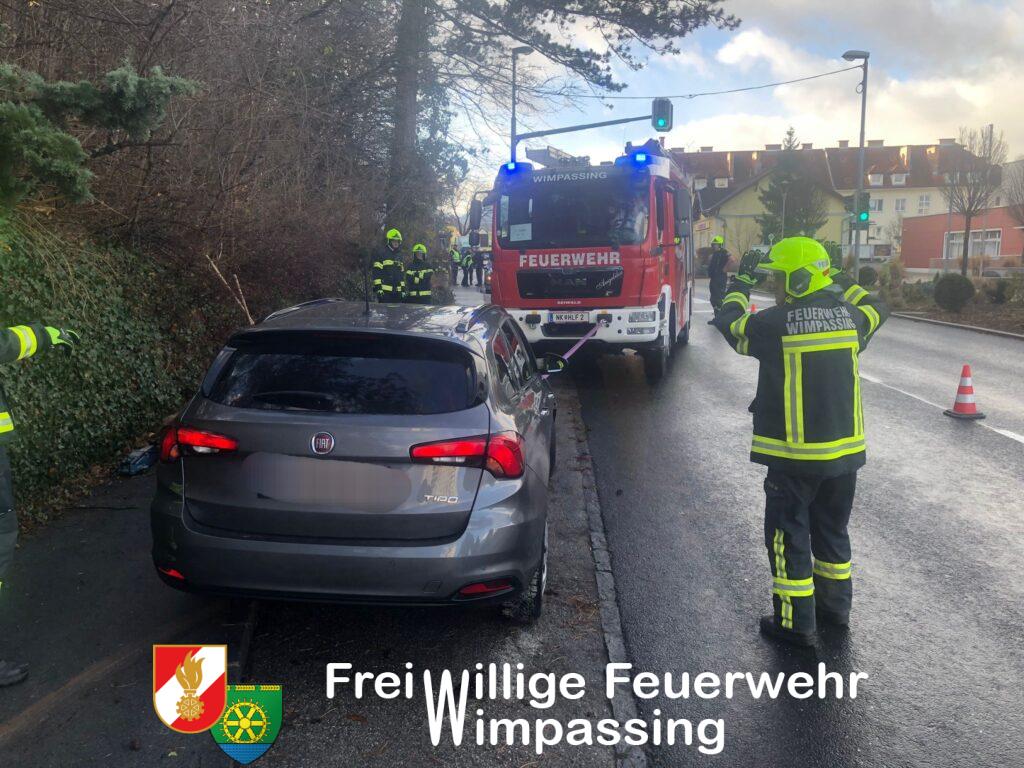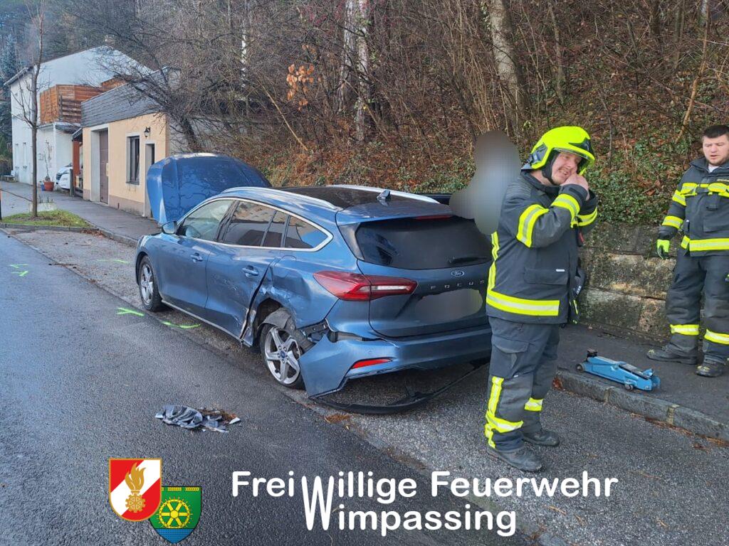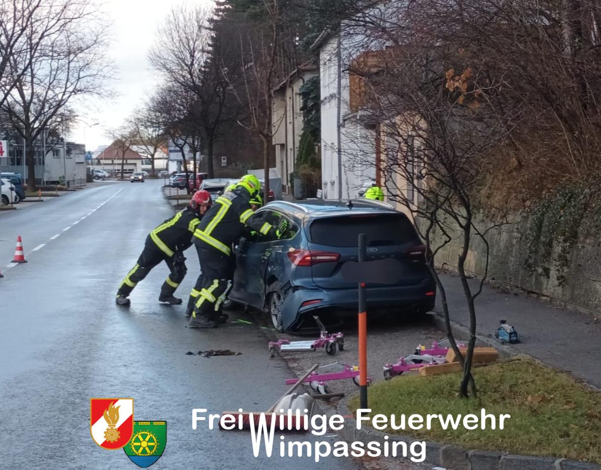 Nach Freigabe der beiden Unfallfahrzeuge durch die Polizei, wurde mit der Fahrzeugbergung begonnen. Ein PKW konnte händisch in eine Parkbucht geschoben werden, der zweite PKW musste mittels Feuerwehrfahrzeug vom Gehweg gezogen werden. Um das Fahrzeug nicht noch mehr zu beschädigen, musste eine Verkehrstafel samt Rohrsteher demontiert werden.