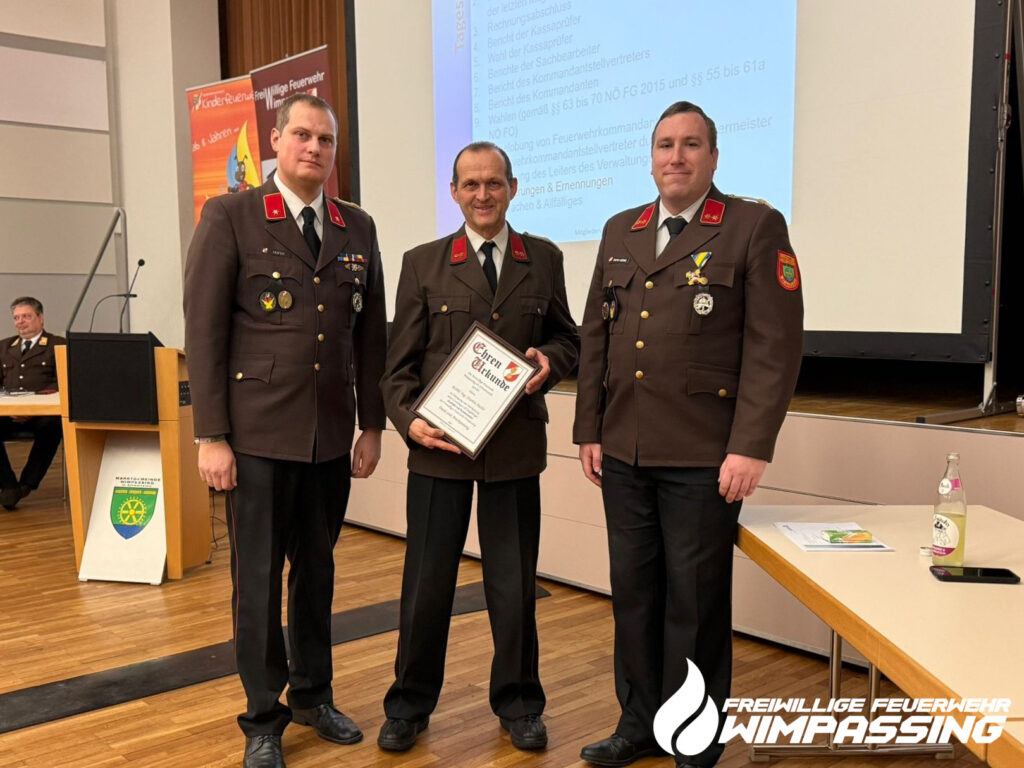 Nach über 30 Jahren als Ausbilder der Feuerwehr zieht sich unser Ehrenkommandant EOBI Martin Atzler nun aus dieser Funktion zurück und erhielt als Dankeschön für seine jahrzehntelange Arbeit eine Ehrenurkunde. Als sichtbares Zeichen der Dankbarkeit wird unser Schulungsraum im Feuerwehrhaus in „EOBI Ing. Martin Atzler Schulungsraum“ umbenannt. Die feierliche Namensgebung wird im Rahmen einer Übung vollzogen – wir werden berichten.