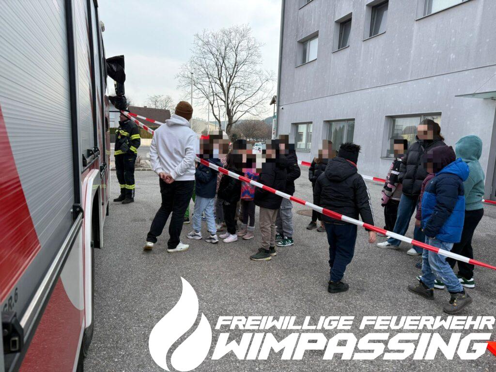 Die 3. Klasse der Volksschule Wimpassing wurde am Mittwoch, den 3. März 2026, von der Polizei im Umgang mit dem „Toten Winkel“ bei Lastkraftwagen geschult. Um das ganze besser darstellen zu können, durften wir hier mit unserem HLF2 mitwirken und es wurden mit Absperrbändern ein toter Winkel erzeugt.